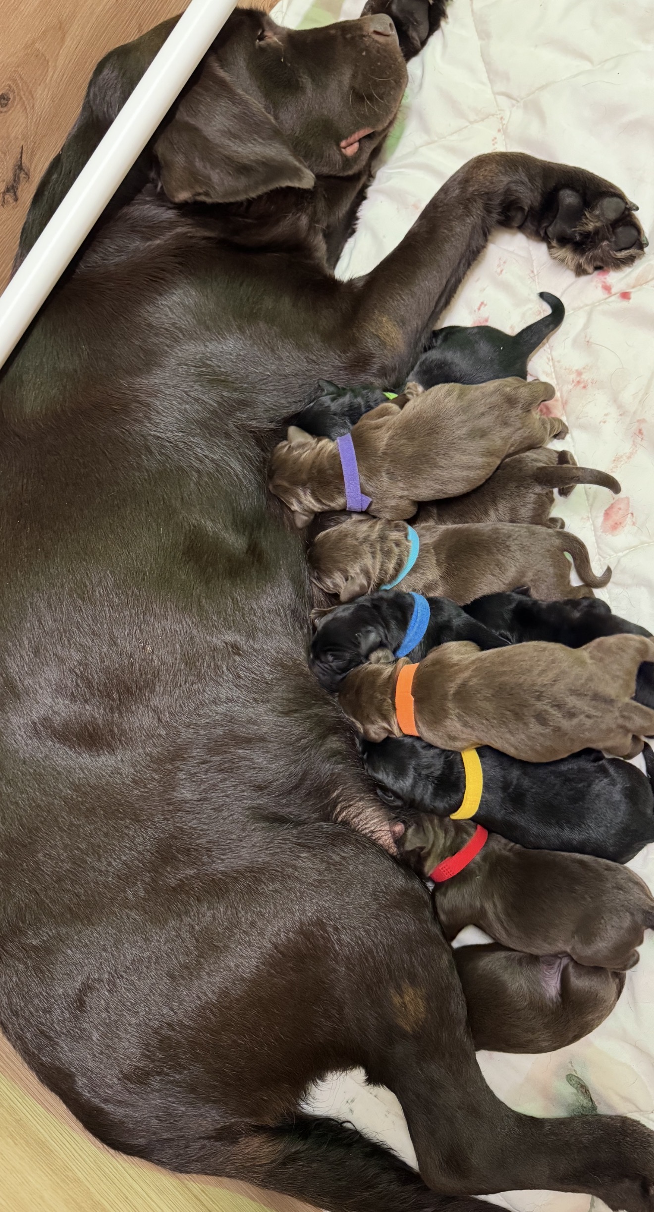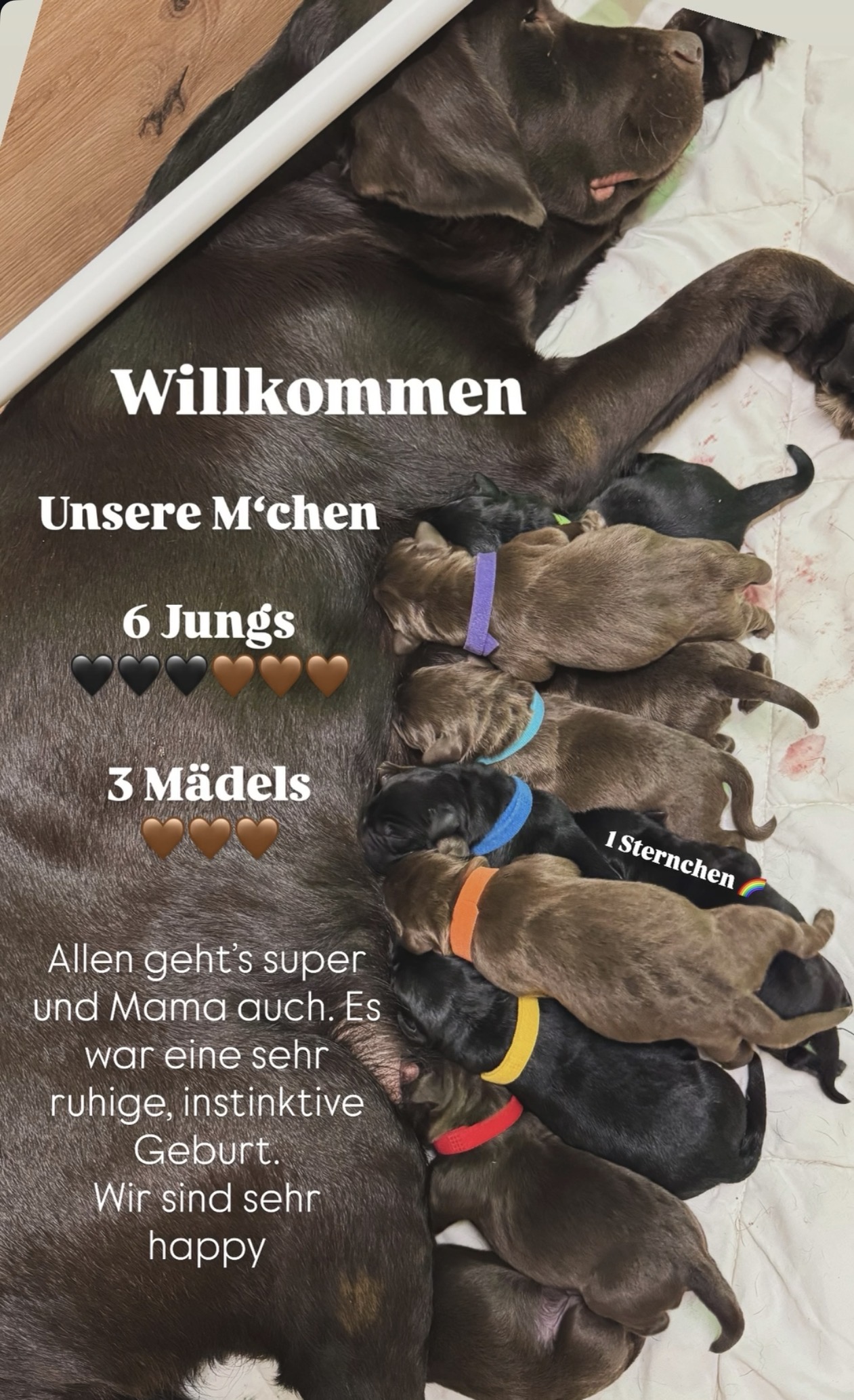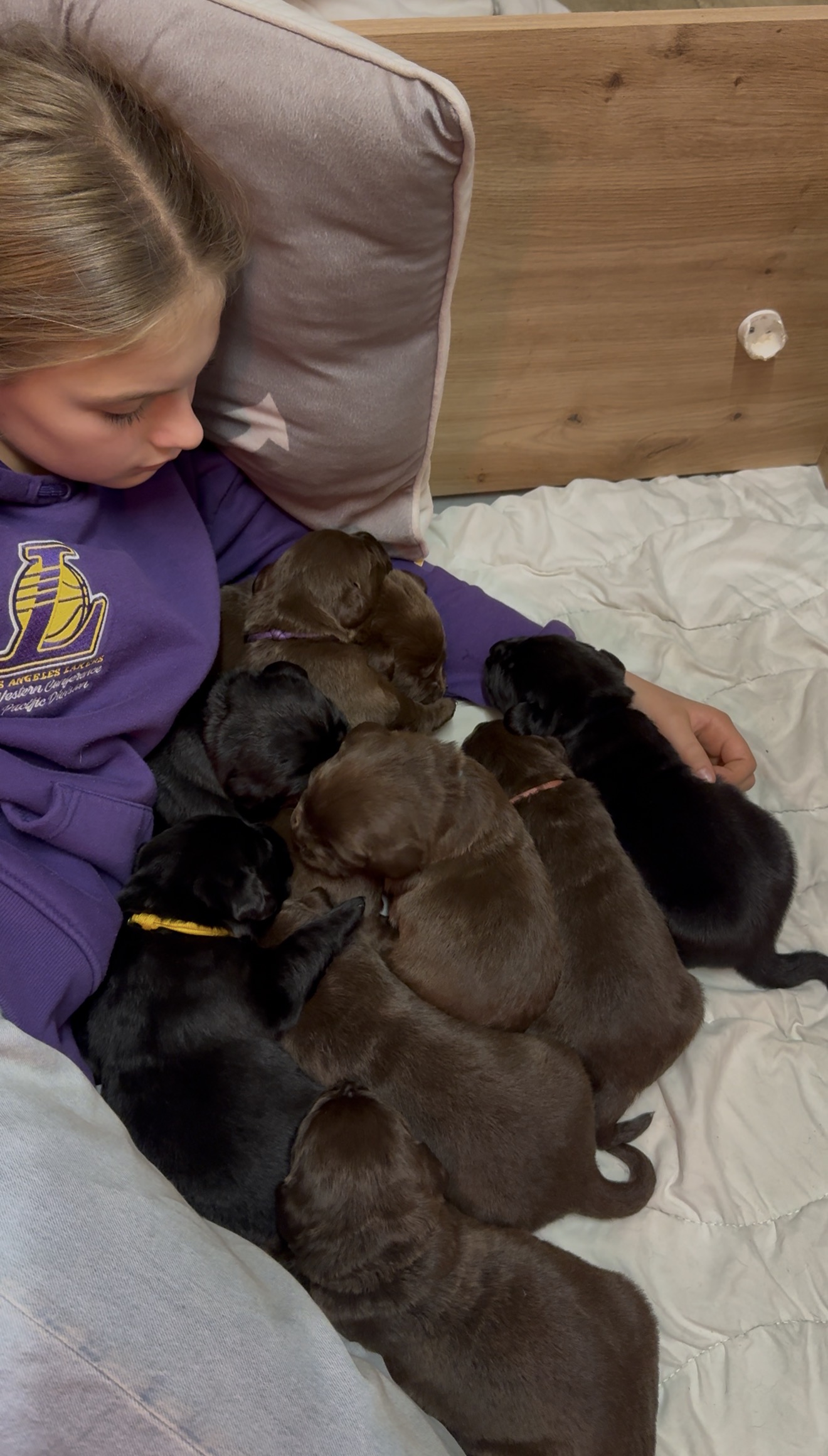 Am 18.10.2025 sind Zolas Welpen innerhalb von 8 Stunden zur Welt gekommen. Insgesamt sind Zola und Sam stolze Eltern von 9 Welpen geworden. Darunter 3 braune Hündinnen und 3 braune Rüden, sowie 3 schwarze Rüden. Zola ist eine liebevolle Mama.